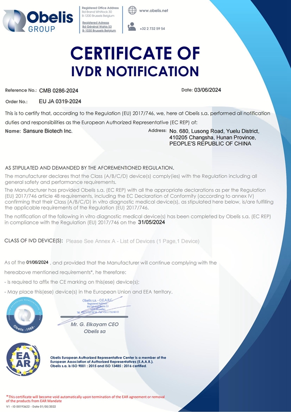 近日,圣湘生物自主研发的结核分枝杆菌核酸检测试剂盒(PCR-荧光探针法)获欧盟CE IVDR认证,这是公司呼吸道产品获得的首个Class C级别的准入证书,为公司结核产品的全球布局提供了有力支持,也为全球在2030年前消灭结核的目标贡献了“圣湘力量”。